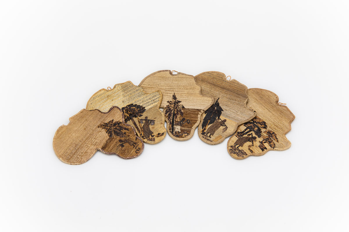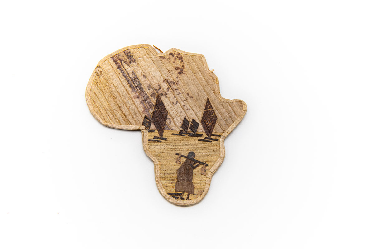 Piccola raffigurazione del continente africano realizzata su foglie di banano con incisioni di scene di vita quotidiana.